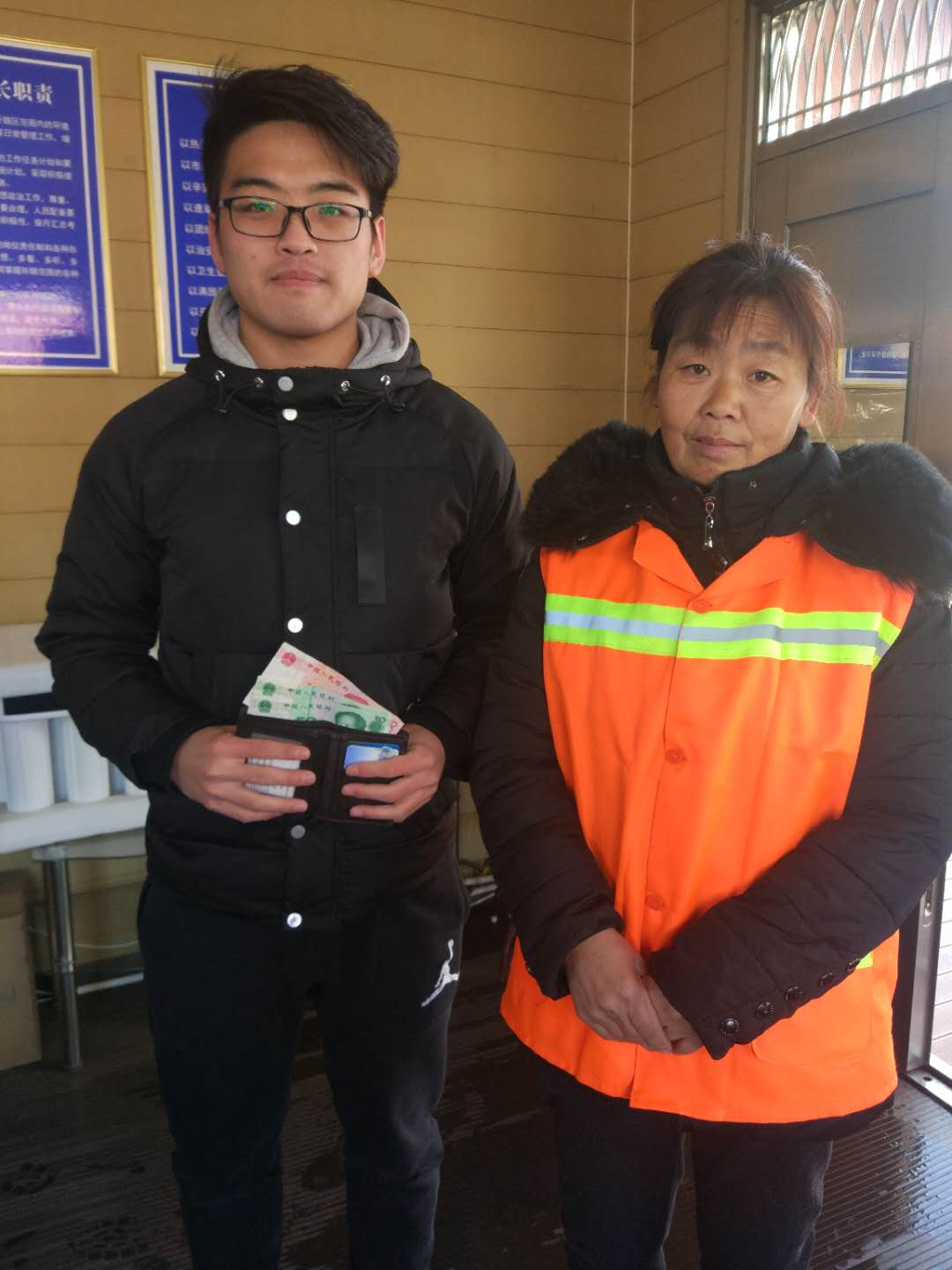 今年1月31日,我公司人民廣場(chǎng)保潔點(diǎn)的保潔員武彩霞在清理衛(wèi)生時(shí),撿到一個(gè)男士錢包,內(nèi)有身份證、學(xué)生證、數(shù)張現(xiàn)金,多張銀行卡等貴重物品,考慮到失主丟失物品的焦急的心情,武彩霞迅速將這一情況報(bào)至其主管處,并通過努力最終找到了失主,將錢包歸還失主。失主在取回自己的錢包時(shí),非常激動(dòng)的說:“謝謝,謝謝”。