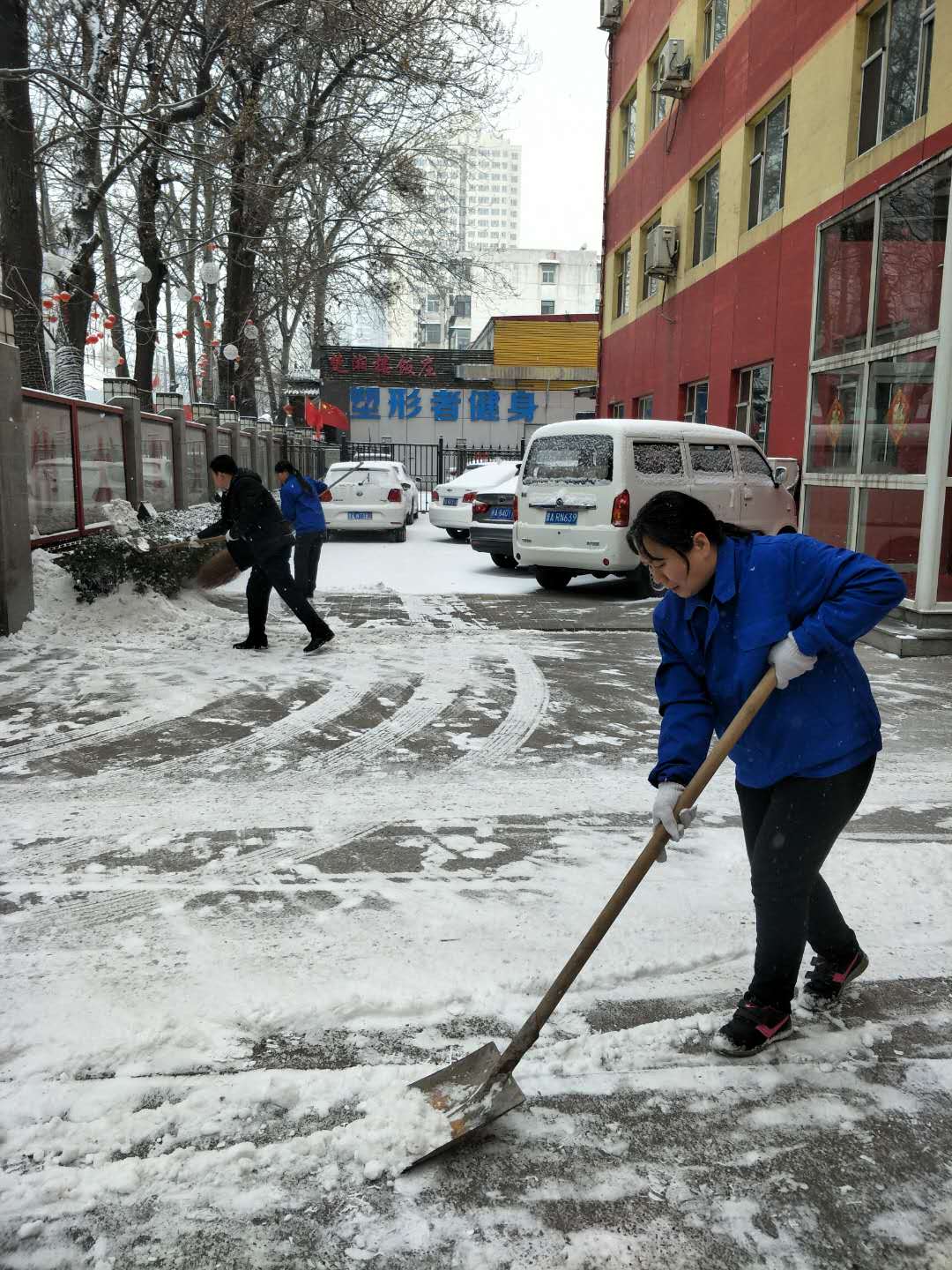 公司管理人員積極組織各項目點(diǎn)員工進(jìn)行主干道路面清雪(左上圖為晉城職業(yè)技術(shù)學(xué)院、右上圖為太原體彩中心)