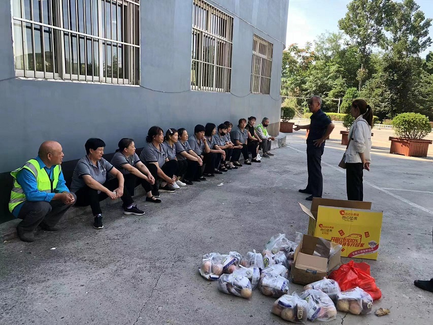 工會(huì)主席崔偉一行先后走訪萬達(dá)廣場(chǎng)、山西科技學(xué)院、晉城市金鳳凰廣場(chǎng)、鳳西廣場(chǎng)、白馬寺、青蓮寺、陽(yáng)城北留潔霸洗業(yè)等地,對(duì)戶外高溫下作業(yè)的高空清洗員工、物業(yè)保潔員工、環(huán)衛(wèi)員工、園林綠化員工及洗衣廠員工等一線勞動(dòng)者進(jìn)行慰問。崔主席充分肯定了高溫下堅(jiān)持奮戰(zhàn)在一線員工的敬業(yè)精神,感謝他們?yōu)闈嵃浴皯?zhàn)高溫、斗酷暑”付出的辛勤勞動(dòng),并將面包、桃子、白糖等慰問品送到員工手中,讓高溫下堅(jiān)守在一線的員工感受到來自潔霸大家庭的關(guān)愛。
