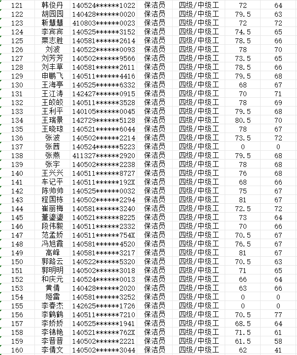 晉城市潔霸清潔服務(wù)股份有限公司職業(yè)技能等級認(rèn)定中心現(xiàn)將2024年2月4日認(rèn)定人員成績公示如下: