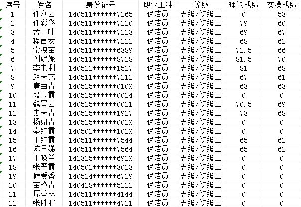 晉城市潔霸清潔服務(wù)股份有限公司職業(yè)技能等級(jí)認(rèn)定中心2024年9月15日第38批保潔員初級(jí)認(rèn)定人員成績(jī)公示