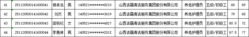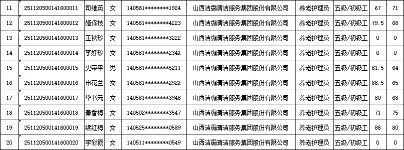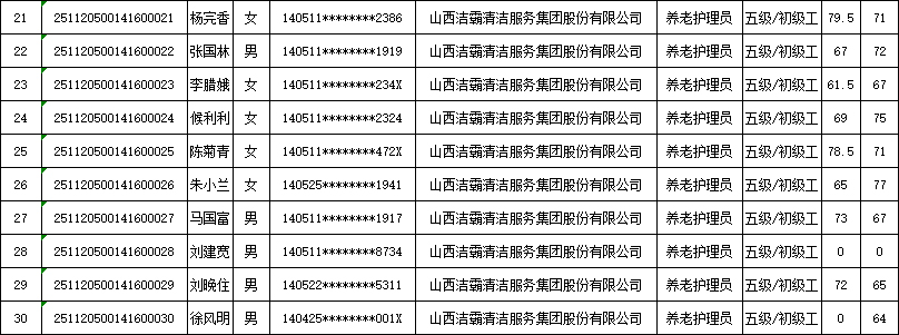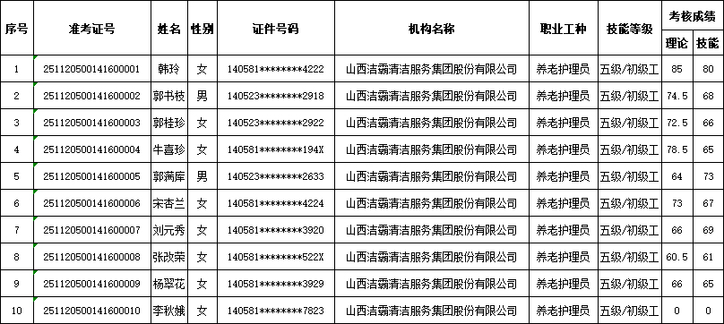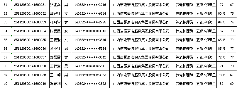 山西潔霸清潔服務(wù)集團(tuán)股份有限公司職業(yè)技能等級(jí)認(rèn)定中心現(xiàn)將2025年11月22日認(rèn)定人員成績公示如下:
